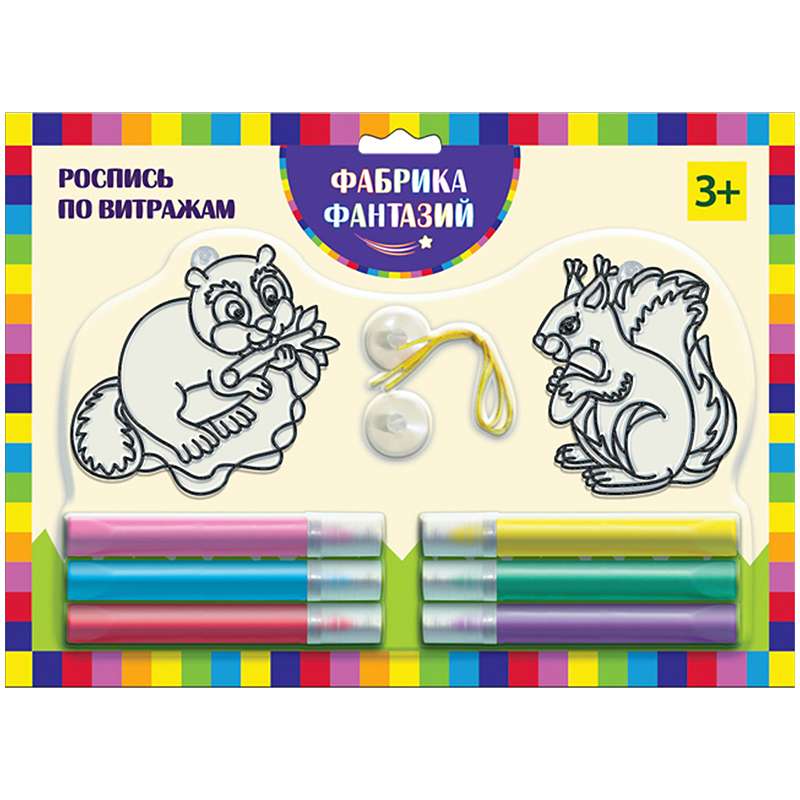 Набор для росписи витража "Белочка и бобер". В наборе: две пластиковые основы, витражные краски в тюбиках 6 цветов, две присоски на веревочках. Упаковка блистер.Набор для росписи витража "Белочка и бобер"