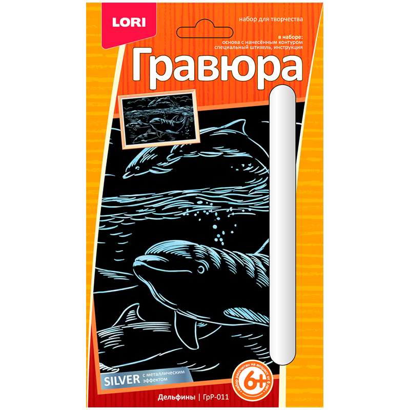 Гравюра - особый вид графического искусства. Сцарапывая верхний слой гравюры специальным штихелем, входящим в набор, ребёнок создает картину-гравюру. Состав: основа с контуром рисунка, штихель, инструкцияГравюра малая с эффектом серебра "Дельфины"
