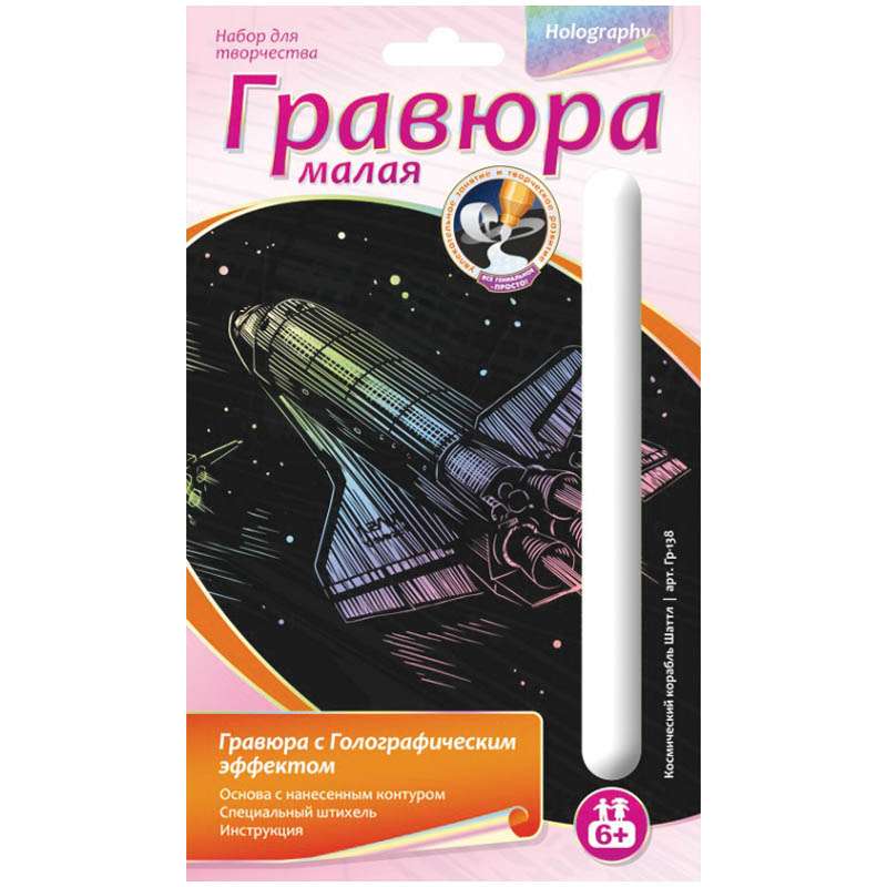 Гравюра малая с эффектом голографик. В комплекте: основа с контуром, штихель, инструкция. Контур рисунка уже нанесен на черный фон. С помощью специального штихеля изображение процарапывается, и из-под слоя краски появляется разноцветная радужная основа. В результате получается контрастный рисунок.Гравюра малая с голографическим эффектом "Космический корабль "Шаттл"