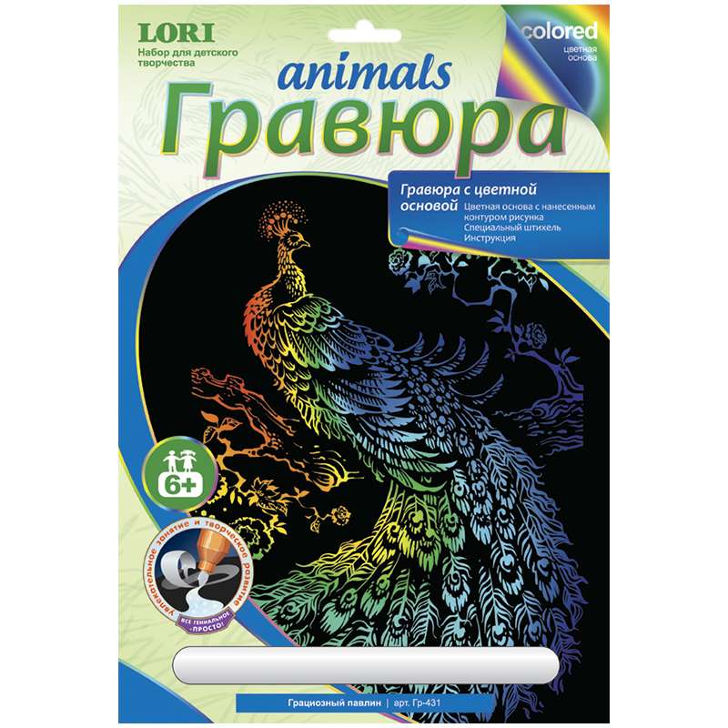 Главная / Товары / КАНЦТОВАРЫ / УПАКОВКА / ХОЗ ТОВАРЫ / РАСХОДНЫЕ МАТЕРИАЛЫ / Канцелярские товары - Школьные / Товары для творчества и хобби / Наборы для детского творчества / Наборы для создания гравюр / Гравюра с цветной основой Lori "Грациозный павлин"
