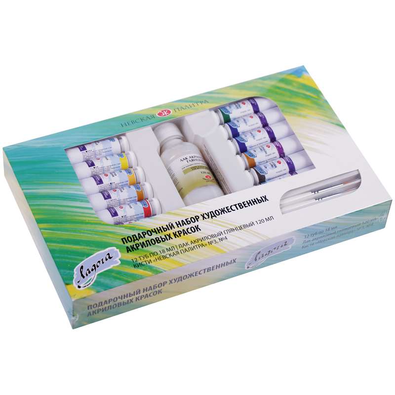 Состав набора: белила титановые, лимонная, желтая средняя, охра светлая, сиена натуральная, розовая темная, красная, ультрамарин, голубая «ФЦ»,зеленая средняя, умбра жженая, сажа газовая, лак акриловый глянцевый 120 мл, кисти "Невская палитра" синтетика (длинная круглая ручка №3 и плоская ручка №4).Набор художественный Ладога, 15 предметов, картон