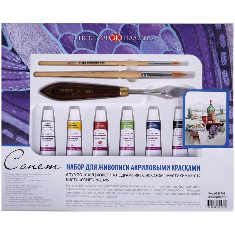 В состав набора входят 6 цветов акриловых красок в тубах по 10 мл: белила титановые, желтая средняя, красная светлая или красная темная, зеленая светлая или зеленая темная, синяя светлая, черная, холст грунтованный на подрамнике 24*30 см с эскизом, мастихин №1020, кисти художественные синтетические (короткая ручка №2 и №5).Набор художественный Сонет "Натюрморт", 10 предметов, картон