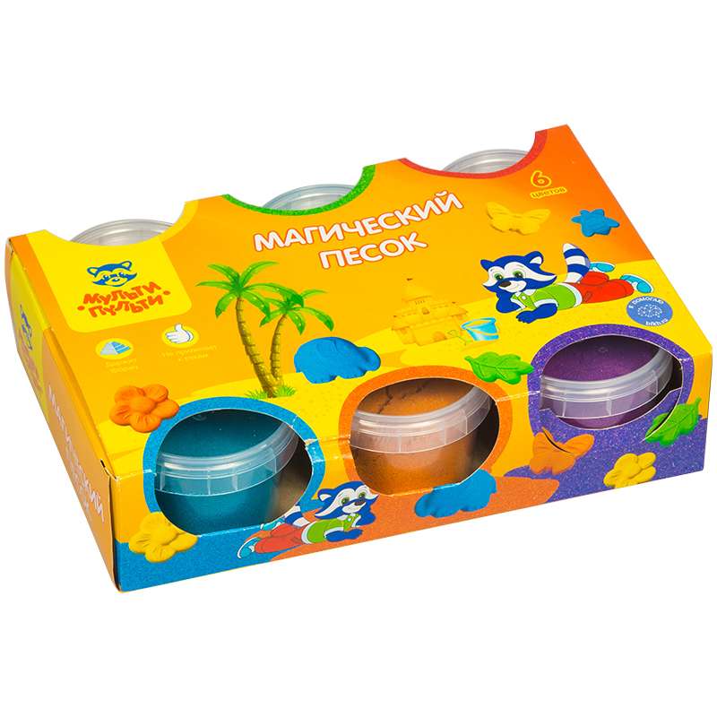 Магический песок не рассыпается и не высыхает, держит форму, лепится с помощью формочек или просто руками. С его помощью легко проявить фантазию и сделать яркие многоцветные или одноцветные фигурки. В комплекте две формочки.Песок для лепки Мульти-Пульти "Приключения Енота", 06 цветов, 840г, 2 формочки