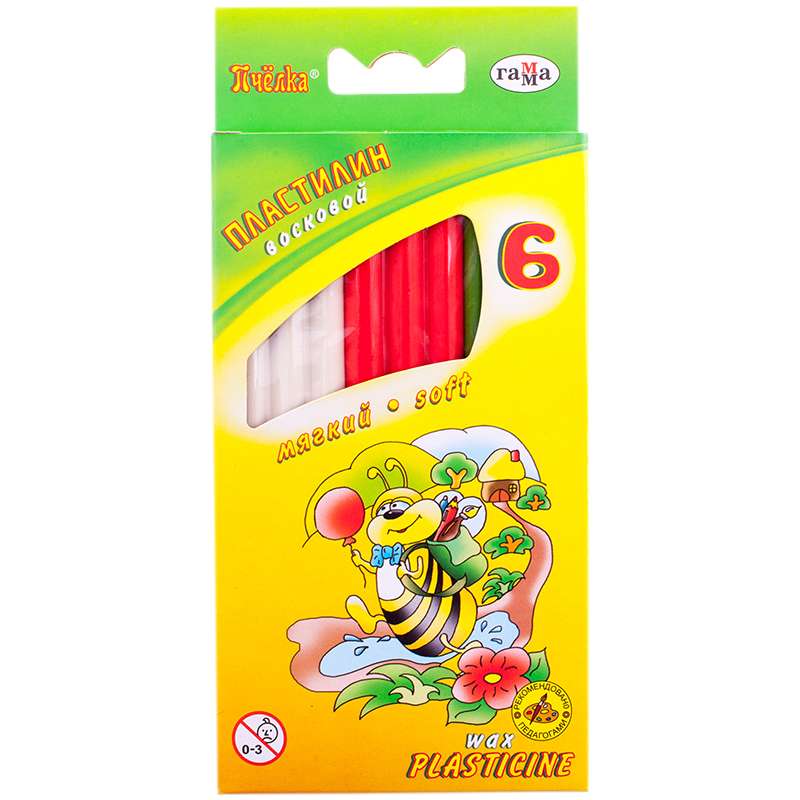 Предназначен для занятий лепкой. Развивает детскую микромоторику и творческие способности. Благодаря добавлению натурального воска, пластилин быстрее размягчается, цвета смешиваются легче. Пластилиновая масса не имеет запаха, не вызывает аллергических реакций, не токсична. В набор входят 6 брусочков различных цветов и стек. Упаковка пластилина - картонная коробка.Пластилин Гамма "Пчелка", 06 цветов, восковой, со стеком, картон, европодвес