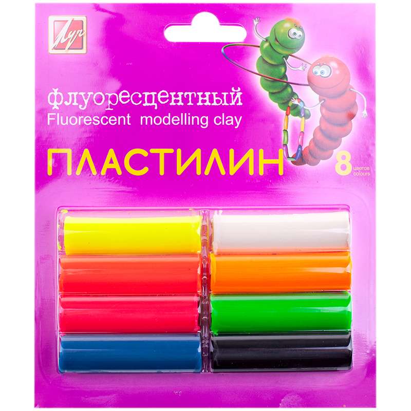 Пластилин флуоресцентный имеет яркие и насыщенные цвета. Обладает отличными пластичными свойствами, хорошо разминается. Готовые поделки отличаются яркостью, красочностью. Выпускается в картонной коробке со стеком.Пластилин Луч "Флюрисветики", 08 цветов, 130г, со стеком, картон, европодвес