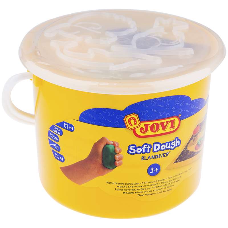 Набор мягкой детской пасты Blandiver с инструментами в удобном пластиковом ведерке. Четыре ярких цвета из "основной" палитры - желтый, красный, синий, зеленый в баночках по 50 гр объемом 70 мл. В наборе также 6 формочек в виде предметов окружающего мира, 3 пластиковых стека и клеенка для лепки.На крышке ведерка размещены три дополнительные фигурки животных, которые тоже можно использовать в процессе создания поделок. Blandiver - мягкая игровая детская паста для лепки с малышами от 2х лет (аналог соленого теста). Натуральный продукт на основе муки, соли и воды. Безвредная, но с неприятным соленым вкусом. Супер мягкая, очень свежая по текстуре,приятная на ощупь, не липкая. Пищевые красители, исключительно безопасный состав. Не имеет химического запаха. Паста легко принимает нужную форму, идеально подходит для маленьких слабых детских рук и предназначена для знакомства ребенка с лепкой и создания простых фигурок руками или с помощью формочек и экструдеров. Помогает развивать мелкую моторику, воображение и интуицию ребенка. Затвердевает на воздухе, сохраняет яркий цвет. После высыхания паста легко снимается влажной губкой или щеткой с одежды, ковров и др. поверхностей, не оставляя следов. Страна производства Испания.Тесто для лепки JOVI, 04 цвета*50г, аксессуары, пластиковое ведро