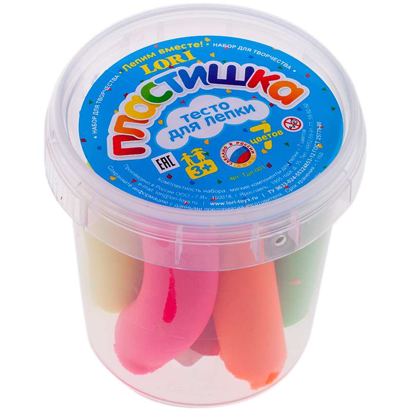 Свойство теста затвердевать позволяет использовать готовые фигурки в играх. Тесто является соленым, содержит только растительные компоненты, цвета легко смешиваются, затвердевает на воздухе, не пристает к рукам во время лепки.Тесто для лепки Lori "Пластишка", 07 цветов*15г, пластиковый стакан
