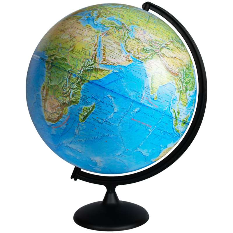 Глобус дает представление о строение поверхности Земли. На нем отображены линии картографической сетки, гидрографическая сеть, рельеф суши и морского дна, элементы почвенно-растительного покрова, крупнейшие населенные пункты, теплые и холодные течения, коралловые рифы, зимняя граница плавающих льдов, маршруты экспедиций Магеллана и Колумба.Глобус физический Глобусный мир, 42см, на круглой подставке