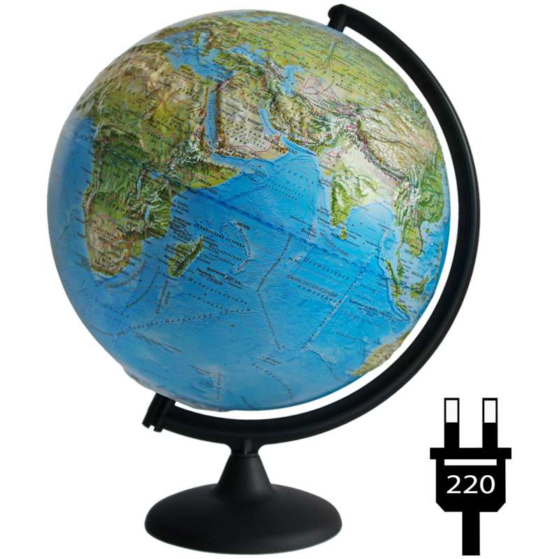 Без подсветки глобус дает представление о строение поверхности Земли. На нем отображены линии картографической сетки, гидрографическая сеть, рельеф суши и морского дна, элементы почвенно-растительного покрова, крупнейшие населенные пункты, теплые и холодные течения, коралловые рифы, зимняя граница плавающих льдов, маршруты экспедиций Магеллана и Колумба. При включение подсветки границы государств окрашиваются яркими цветами.Глобус физико-политический рельефный Глобусный мир, 32см, с подсветкой на круглой подставке