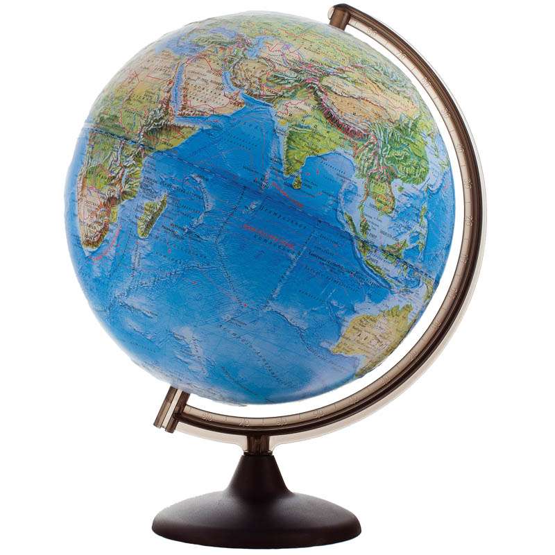 Глобус для занятий по географии на подставке, рельефный. Компактен и нагляден. Диаметр глобуса - 320 мм. На глобусе нанесено изображение Ландашфта Земли как она выглядит из космоса, что дает лучшее предстваление о Ландшафте, чем классический физический глобус. На нем отображены линии картографической сетки, гидрографическая сеть, рельеф суши и морского дна, элементы почвенно-растительного покрова, крупнейшие населенные пункты, теплые и холодные течения, коралловые рифы, зимняя граница плавающих льдов, маршруты экспедиций Магеллана и Колумба. А также политическое устройство мира.Глобус ландшафтный рельефный Глобусный мир, 32см, на круглой подставке