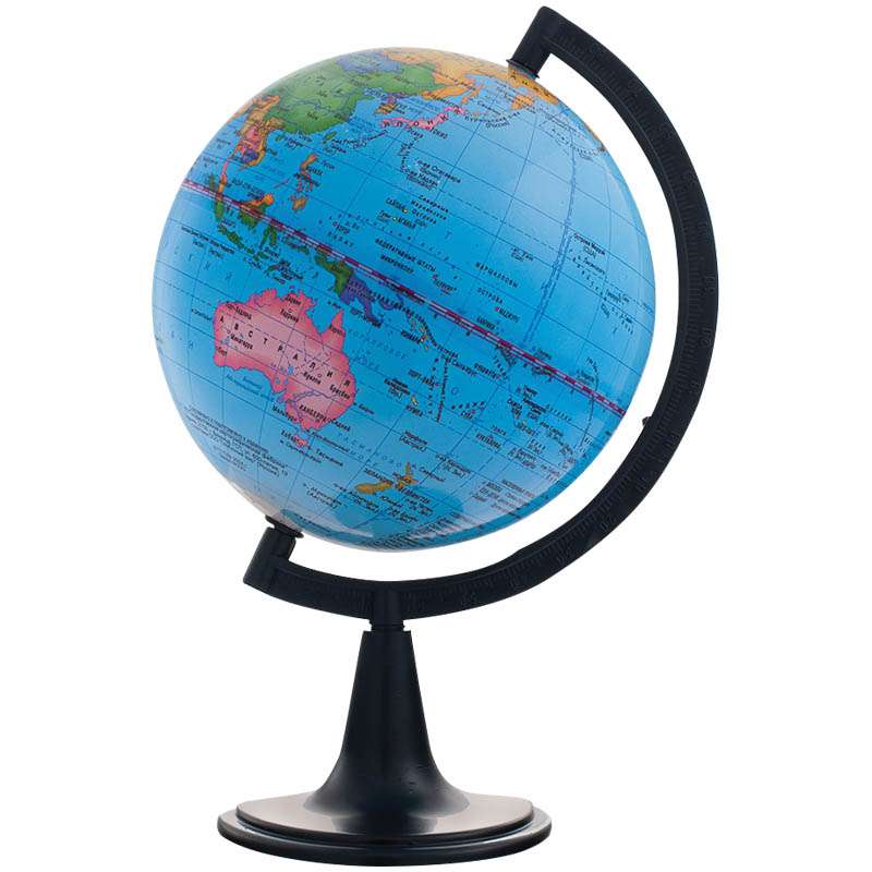 На глобусе, на общегеографической основе показаны границы государств и демаркационные линии, столицы и крупные населенные пункты, железные дороги и морские рейсы, научные станции в Антарктике, линии перемены дат.Глобус политический Глобусный мир, 15см, на круглой подставке