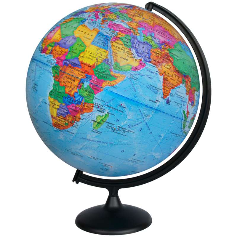 Призваны дать представление о политическом устройстве мира. На нем, на общегеографической основе, показаны границы государств и демаркационные линии, столицы и крупные населенные пункты, железные дороги и морские рейсы, научные станции в Антарктике, линии перемены дат.Глобус политический Глобусный мир, 42см, на круглой подставке