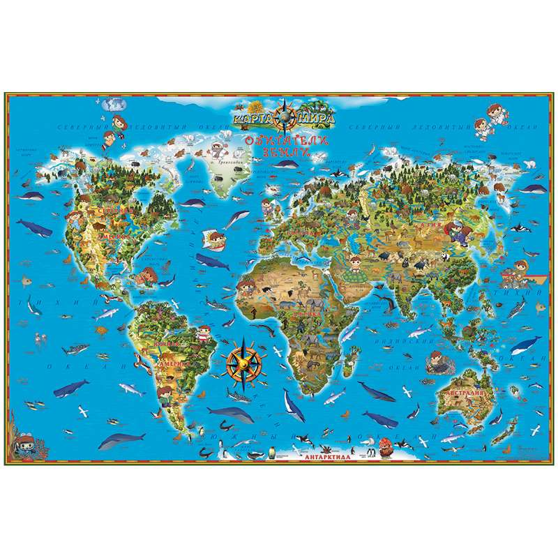 Красочная и информативная карта для наглядного обучения детей станет замечательным пособием при изучении географии и природоведения. На карте изображены все самые известные представители мировой фауны. С помощью такой карты ребенок легко усвоит названия континентов, островов, морей и океанов, связав их со знакомыми животными. Размеры карты позволяют разместить ее на любой стене детской комнаты. Плотная ламинированная бумага защищает карту от повреждений, заломов и потертостей, а покрытие уменьшает риск выцветания красок на солнце.Карта "Мир" Обитатели Земли DMB, 1290*890мм, матовая ламинация