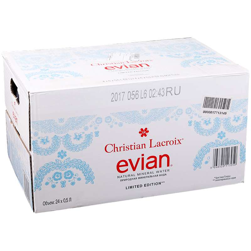 Добывается на северном склоне французских Альп, в районе далеком от городов и промышленного производства. Общая минерализация 0.3-0.75 г/л. Минеральный состав мг/л: кальций — 70-90, магний — 20-40, натрий+калий — 10, сульфат — 15, хлор — 10, гидрокарбонаты — 340–370, нитраты — 3.9, кремнезем — 9-17. Поставляется в ПЭТ, в одной упаковке 24 бутылок. Хранить при температуре от +2 до +40 градусов. Срок хранения 24 месяца.Вода минеральная негазированная Evian, 0,5л, пластиковая бутылка