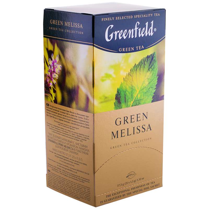 Индивидуальность натуральной композиции Green Melissa создает гармоничное сочетание зеленого чая и душистых трав – мяты и мелиссы. Душистая мята исцеляет от недугов, сохраняет гибкость ума и уравновешивает эмоции. Аромат мяты служил добрым признаком, поднимал настроение и способствовал оживлению застольной беседы. Тонким аромат мелиссы напоминает тонкий аромат лимона. Настой этого чая имеет чистый зеленоватый тон, очень нежный шелковистый вкус, а аромат сочетает разнообразные пряные оттенки. Превосходно освежает, успокаивает и помогает снять эмоциональное напряжение.Чай Greenfield "Green Melissa", зеленый с мелиссой, 25 фольг. пакетиков по 1,5г