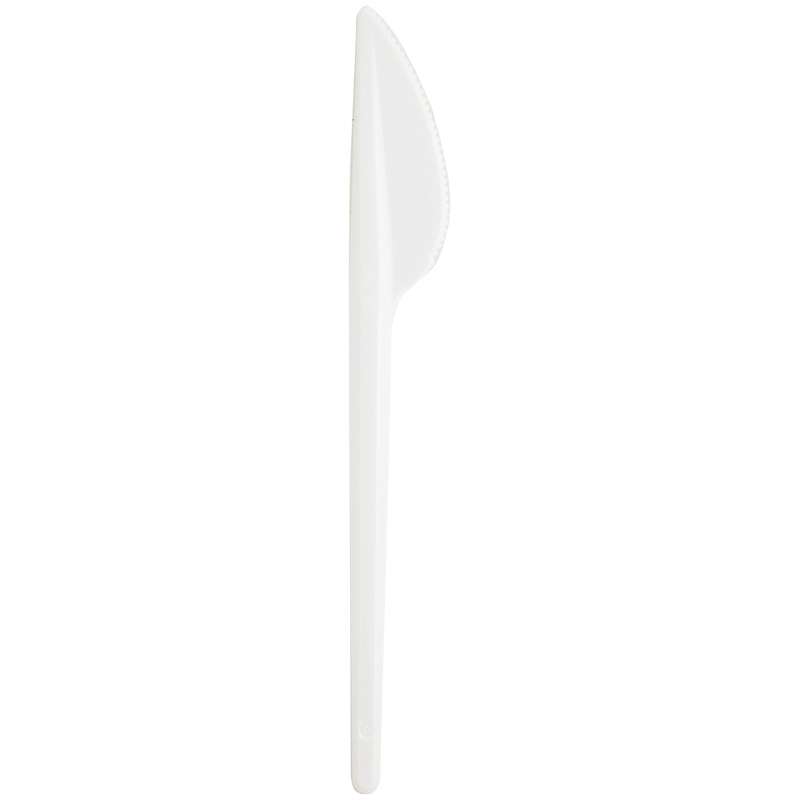 Нож одноразовый из полистирола белого цвета. Лезвие имеет зубчики, которыми сложно порезаться, но удобно разделывать пищу.Ножи одноразовые Мистерия "Компакт", стандарт , ПС, белые, 16,5см, уп. 100шт.