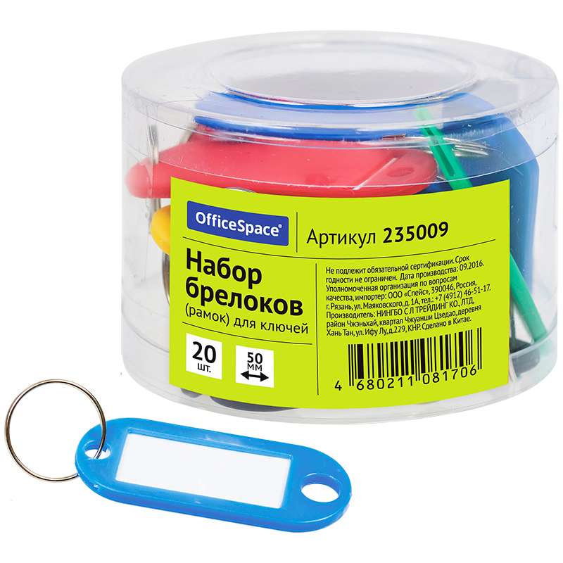 Брелоки для ключей с информационным окном и бумажной вставкой для пометок. Размер берлока 50*22 мм, размер окна 30х14мм. Материал -жёсткий пластик. Упаковка по 20 шт. 5 цветов ассорти.235009 Набор брелоков для ключей OfficeSpace, 50мм, 20шт. 235009 [РЦ]