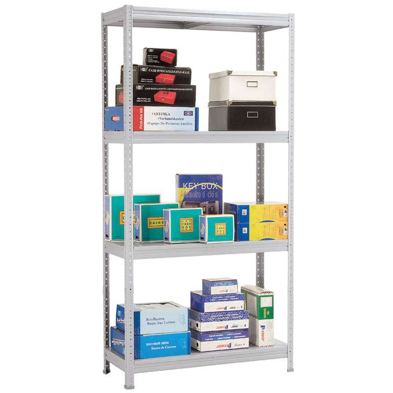 Выпускается два вида стоек: стандартные MS и Strong MS (усиленный угловой профиль), два вида усилителя стоек: Г-образный, сборка осуществляется с использованием резьбового крепежа (болты и гайки), и Т-образный, сборка без гаек. Два вида подпятников: пластиковые или регулируемые металлические. Распределённая нагрузка на полку до 100 кг, с использованием усилителя ребра полки до 150 кг. Максимальная нагрузка на стеллаж с использованием стоек MS - 600 кг, с использованием стоек Strong MS - 750 кг. Полки стеллажа усилены ребром жёсткости. Овальные отверстия для крепления к стойкам (упрощает сборку и разборку). Высота бокового ребра - 33 мм, шаг регулирования высоты полок - 25 мм.Стеллаж MS 1850*1000*300, серый, комплект