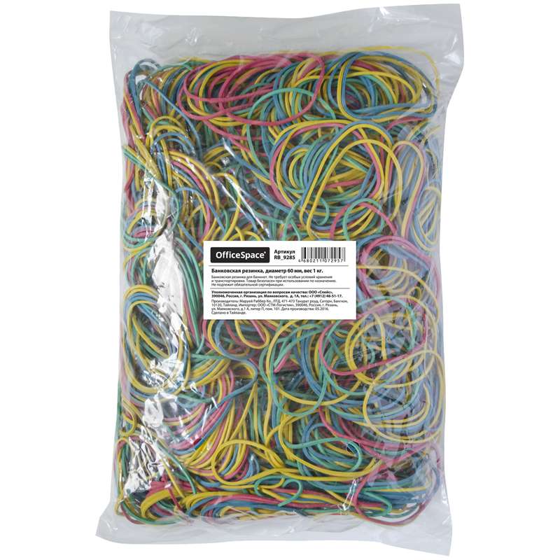 Банковская резинка для денег и бумаг. Упаковка - пакет без европодвеса. Материал - натуральный каучук. Количество резинок в пакете 1300 штук ± 5%.Банковская резинка 1кг OfficeSpace, диаметр 60мм, ассорти