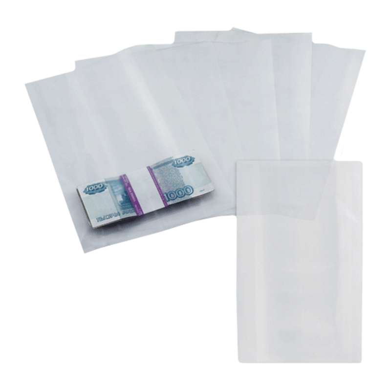 Для вакуумной упаковки необходим особый упаковочный материал, отвечающий требованиям, предъявляемым к хранению и упаковке банкнот. Таким материалом является трехслойный пакет со слоями из полиэтилена и полиамида. Система упаковки банкнот в пакеты осуществляется при помощи вакуумных упаковщиков. Пакеты играют главную роль при упаковке, транспортировке и хранении, которая базируется на том, чтобы как можно дольше не впускать воздух в закрытую упаковку. Применение недоброкачественных пакетов приводит к тому, что воздух просачивается внутрь упаковки и срок хранения банкнот снижается. Трехслойная технология со слоями из полиэтилена и полиамида позволяет гарантировать качество упаковки долгое время. В соответствии с рекомендацией Банка России для упаковки денег с целью обеспечения гарантийной сохранности банкнот следует применять пакеты из трехслойной пленки толщиной 70-100 микрон.Пакет вакуумный трехслойный 200*300мм, 1000шт
