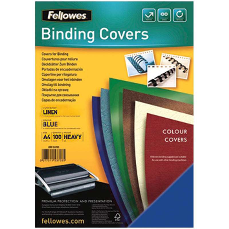 100 шт. в розничной упаковке. Идеально подходит как для переплета на пластиковую, так и на металлическую пружиныОбложка А4 Fellowes "Лен" 250г/кв.м, синий картон, 100л.