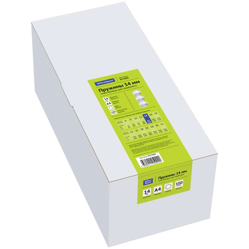 Главная / Товары / КАНЦТОВАРЫ / УПАКОВКА / ХОЗ ТОВАРЫ / РАСХОДНЫЕ МАТЕРИАЛЫ / Офисная техника и расходные материалы / Брощуровщики и расходные материалы для переплета / Пружины для переплета / Пружины пластик D=14мм OfficeSpace, белый, 100шт.