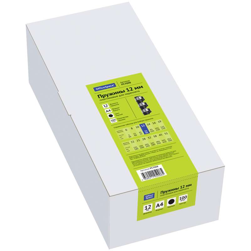 Пластиковые пружины OfficeSpace черного цвета диаметром 12мм предназначены для переплета документов. Легко выдерживают многократное раскрытие при необходимости добавить или удалить листы из готовой брошюры. Рекомендуемый объем брошюры при использовании данного диаметра пружины: 56-80 листов.Пружины пластик D=12мм OfficeSpace, черный 100шт.
