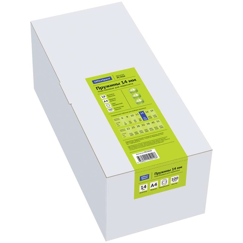 Главная / Товары / КАНЦТОВАРЫ / УПАКОВКА / ХОЗ ТОВАРЫ / РАСХОДНЫЕ МАТЕРИАЛЫ / Офисная техника и расходные материалы / Брощуровщики и расходные материалы для переплета / Пружины для переплета / Пружины пластик D=14мм OfficeSpace, прозрачн. бесцветный, 100шт.