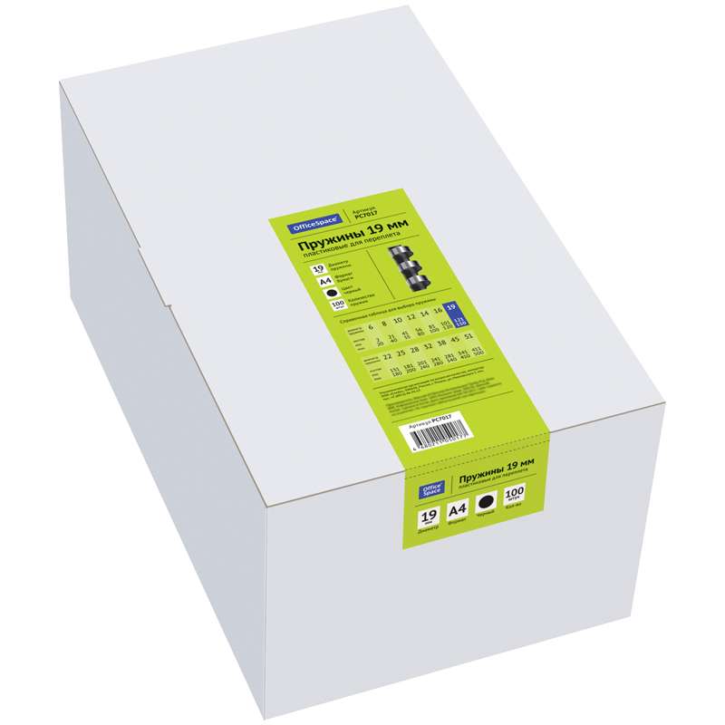 Главная / Товары / КАНЦТОВАРЫ / УПАКОВКА / ХОЗ ТОВАРЫ / РАСХОДНЫЕ МАТЕРИАЛЫ / Офисная техника и расходные материалы / Брощуровщики и расходные материалы для переплета / Пружины для переплета / Пружины пластик D=19мм OfficeSpace, черный, 100шт.