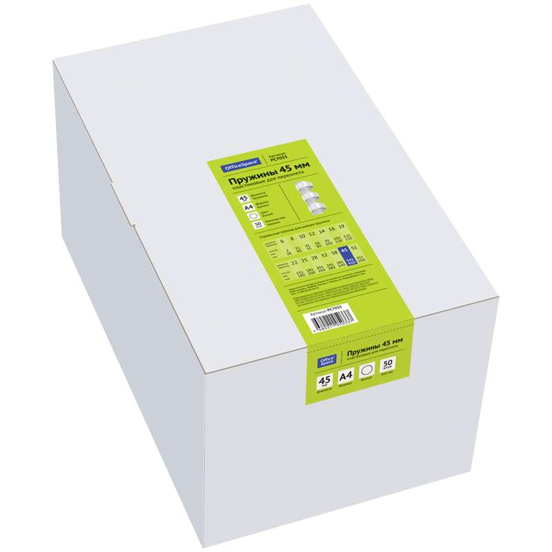 Главная / Товары / КАНЦТОВАРЫ / УПАКОВКА / ХОЗ ТОВАРЫ / РАСХОДНЫЕ МАТЕРИАЛЫ / Офисная техника и расходные материалы / Брощуровщики и расходные материалы для переплета / Пружины для переплета / Пружины пластик D=45мм OfficeSpace, белый, 50шт.