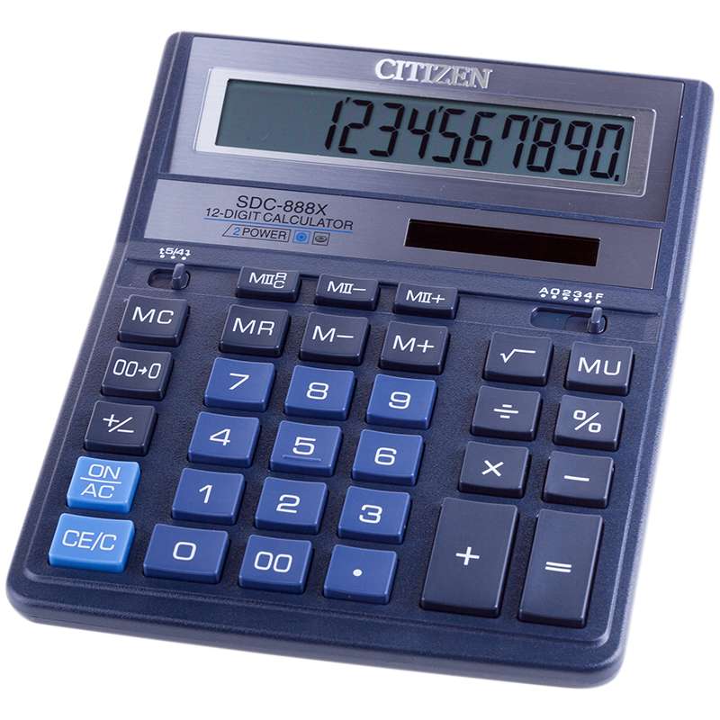 Культовая модель среди калькуляторов Citizen с наиболее удобным расположением кнопок. Фиксированный угол наклона дисплея. Кнопки вычисления процентов, смены знака, двойного нуля, две ячейки для хранения в памяти двух чисел. Функция вычисления с учетом торговой наценки (MU). Поставляется в картонной упаковке с окном. Размер 205*159*27мм144136 Калькулятор настольный SDC-888XBL 12 разрядов, двойное питание, 158*203*31 мм, синий SDC [РЦ]
