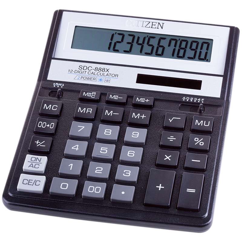 Культовая модель среди калькуляторов Citizen с наиболее удобным расположением кнопок. Фиксированный угол наклона дисплея. Кнопки вычисления процентов, смены знака, двойного нуля, две ячейки для хранения в памяти двух чисел. Функция вычисления с учетом торговой наценки (MU). Поставляется в картонной упаковке с окном. Размер 205*159*27ммКалькулятор настольный SDC-888XBK 12 разрядов, двойное питание, 158*203*31 мм, черный