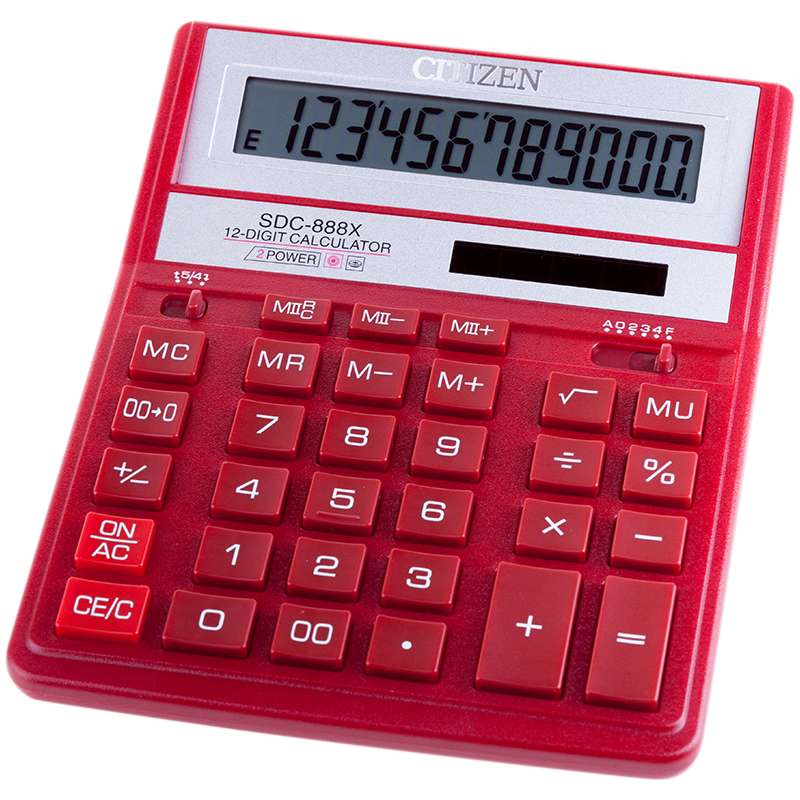 Культовая модель среди калькуляторов Citizen с наиболее удобным расположением кнопок. Фиксированный угол наклона дисплея. Кнопки вычисления процентов, смены знака, двойного нуля, две ячейки для хранения в памяти двух чисел. Функция вычисления с учетом торговой наценки (MU). Поставляется в картонной упаковке с окном. Размер 205*159*27ммКалькулятор настольный SDC-888XRD 12 разрядов, двойное питание, 158*203*31 мм, красный