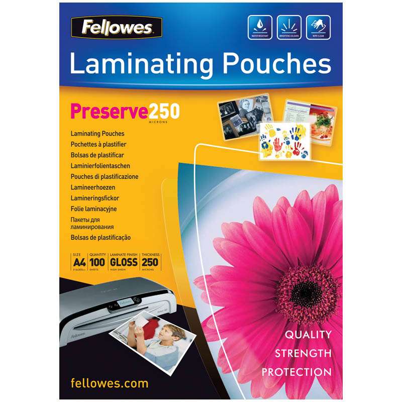Используется для защиты документов от влаги, загрязнения, механических повреждений, придания жесткости и яркости. Обладает высокой прозрачностьюПленка для ламинирования А4 Fellowes 216*303мм, 250мкм, глянец, 100л.