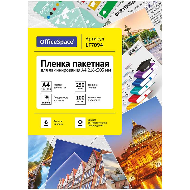 Глянцевая пакетная пленка OfficeSpace размером 216*303мм и плотностью 250мкм прекрасно подходит для ламинирования документов. Предназначена для использования в ламинаторах «горячего» типа. Придает документу жесткость, обладает высокой прозрачностью после ламинации, защищает документ от механических повреждений и воздействия влаги.Пленка для ламинирования А4 OfficeSpace 216*303мм, 250мкм, глянец, 100л.