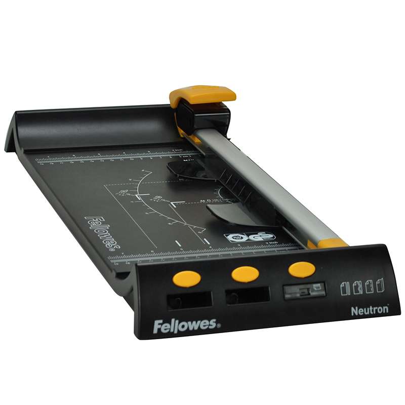 Инновационная система сменных/заменяемых картриджей - SafeCut™ Картридж. Помещенное в пластиковый картридж лезвие гарантирует полную безопасность для пользователя. Картридж освобождает лезвие только в момент резки. Основание со специальными слотами для хранения запасных или сменных картриджей. Комплектуется 1 ножом для прямой резки. Специальный механизм фиксирует режущий картридж на конечной позиции, что облегчает процесс транспортировкиРезак роликовый A4 Fellowes "Neutron" 320мм до 10 листов, пластиковое основание