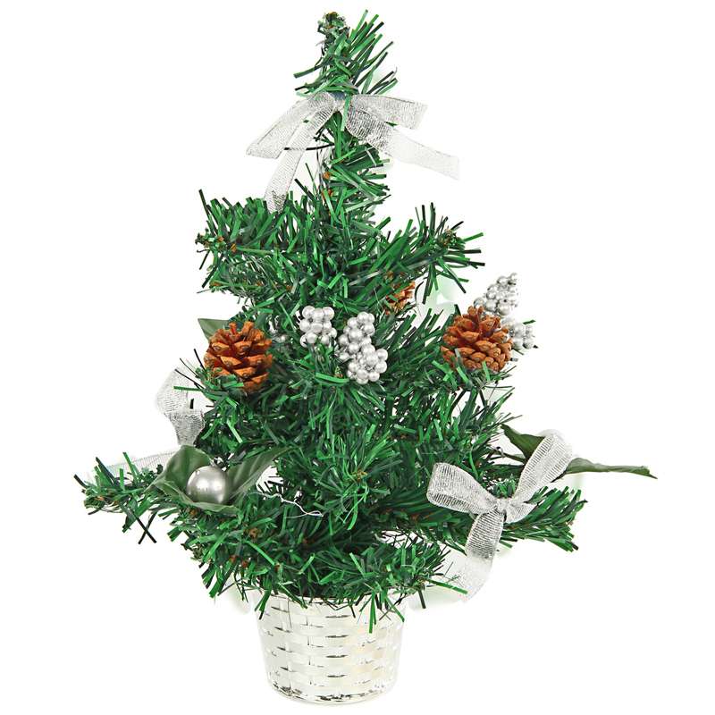 Ель декоративная высотой 30 см, с тремя ягодами, шариками и бантиками серебряного цвета и с 3 натуральными шишками.Ель декоративная с серебряными украшениями 30см
