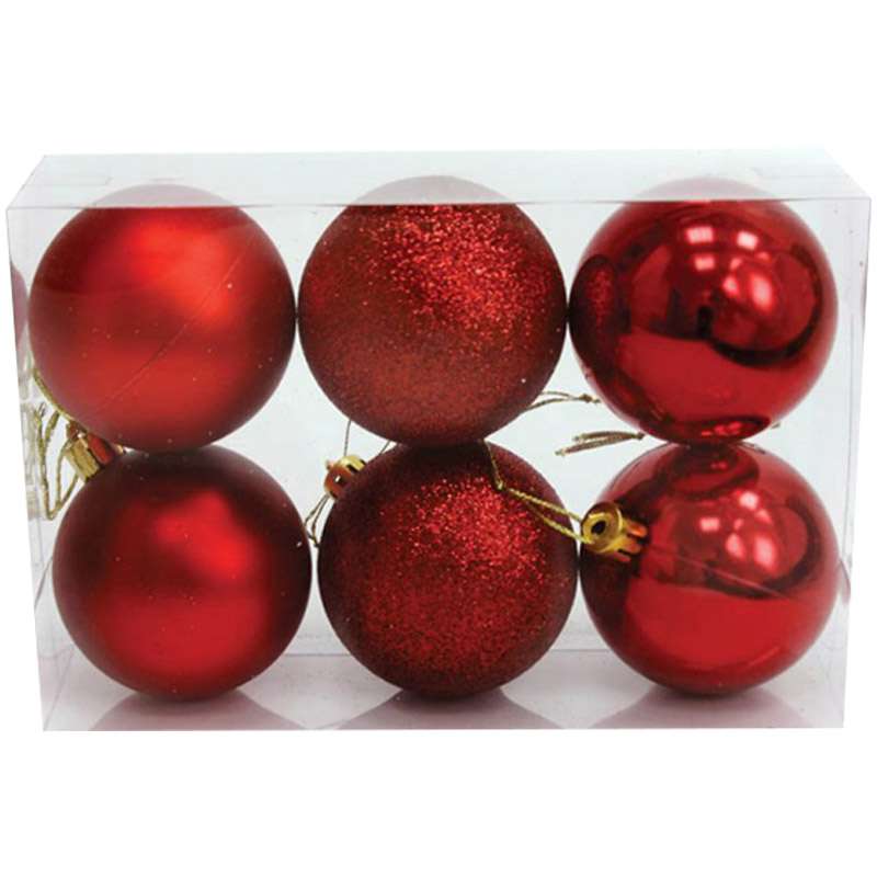 Набор пластиковых шаров. В наборе 2 матовых шара, 2 с глиттером и 2 глянцевых. Такие шары долговечны и практичны. Качество шаров позволяет легко заменить ими стеклянные украшения для ели.Набор пластиковых шаров 6шт., 60мм, красный