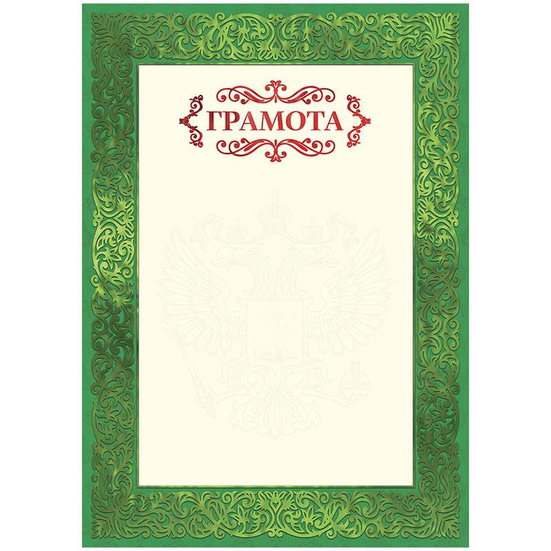 Бланк "Грамота" изготовлен из импортного целлюлозного мелованного картона плотностью 190 г/м2. Отделка бланка выполнена тиснением фольгой. Формат - А4. Наградные грамоты и благодарности используются для выражения признательности сотрудникам, коллегам и партнерам. Бланк подходит для цветной печати.Грамота А4, мелованный картон, двойное тиснение фольгой