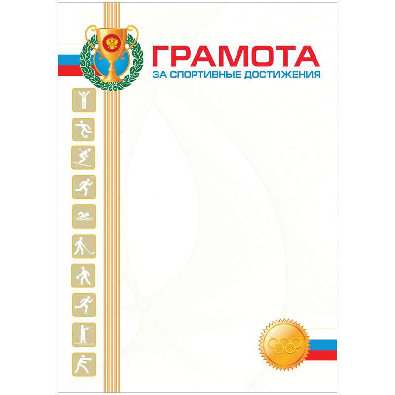 Бланк "Грамота спортивная" изготовлен из импортного целлюлозного мелованного картона плотностью 190 г/м2. Формат - А4. Наградные спортивные грамоты используются для подтверждения высоких достижений в спортивных соревнованиях. Бланк подходит для цветной печати.Грамота спортивная А4, мелованный картон
