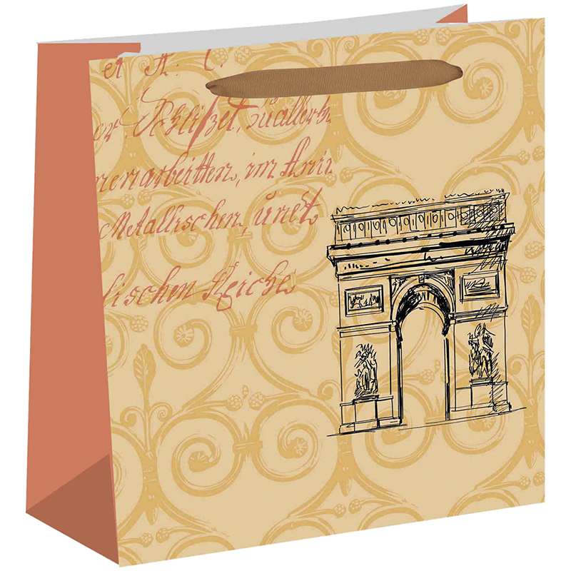 Подарочный пакет бумажный 20*20*8 см, Крафт натуральный. Подарок, преподнесенный в красивой упаковке, будет вдвойне приятней для получателя. Для удобной переноски на пакете имеются две ручки. Такая подарочная упаковка, декорированная красочным рисунком, станет последним штрихом для идеального подарка.Пакет бумажный 20*20*8см, "Арка", крафт натуральный