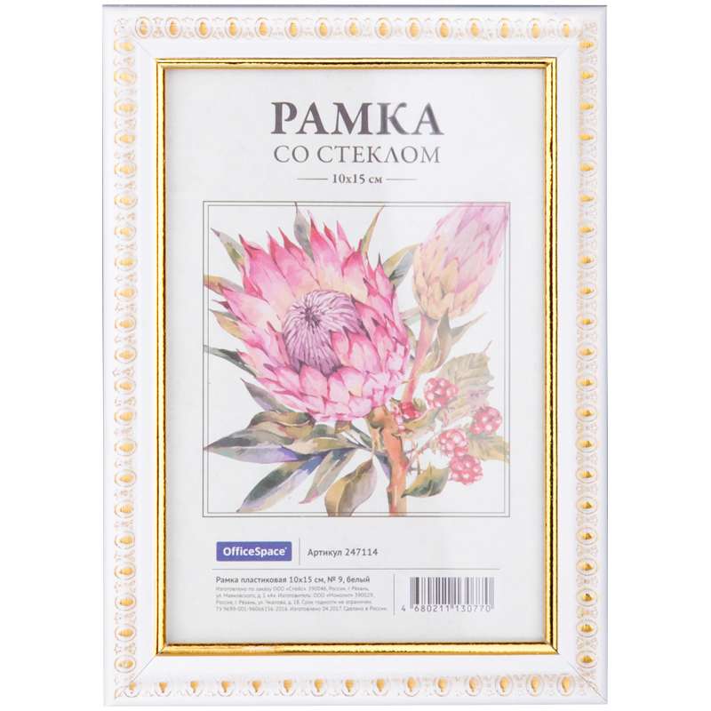 Рамка поможет на долгое время сохранить памятный диплом, грамоту или фотографию. Рамка из пластика выглядит стильно и демократично, что позволит ей вписаться в любой интерьер.Рамка пластиковая 10*15см, № 9, белый/золото