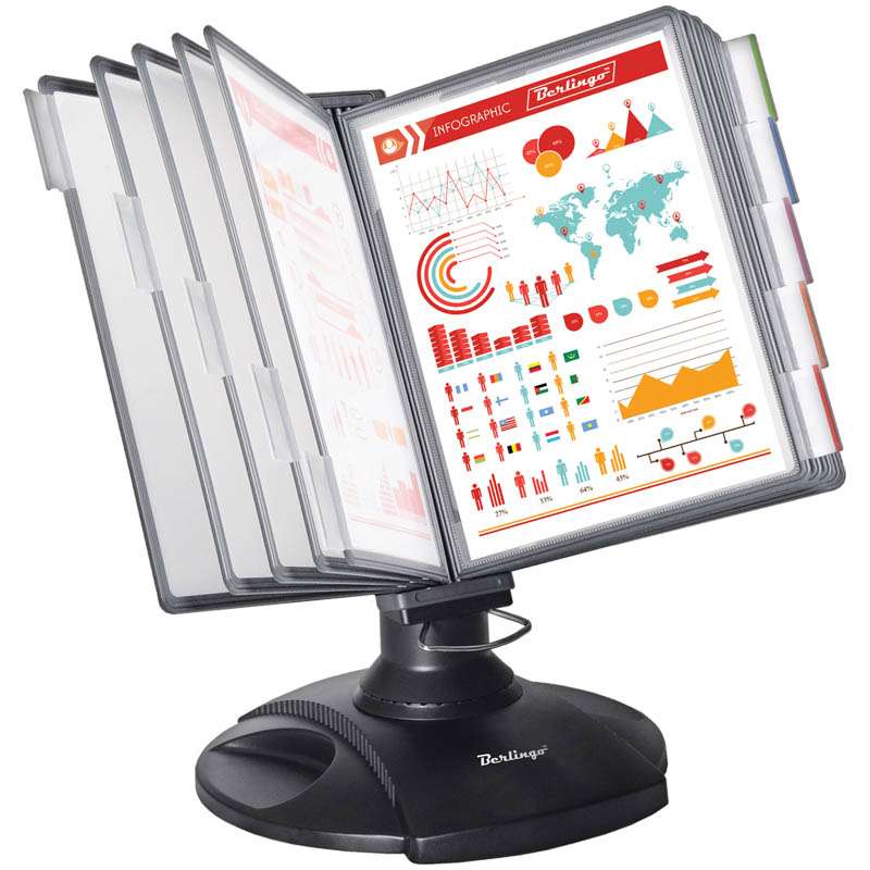 Устойчивое утяжеленное основание демосистемы. Вращающееся крепление панелей обеспечивает быстрый доступ к документам. Поворот на 360 градусов и наклон панелей гарантируют удобство пользователю. Простота сборки. Быстрая замена документов.Демосистема настольная Berlingo с 10 панелями, вращающаяся